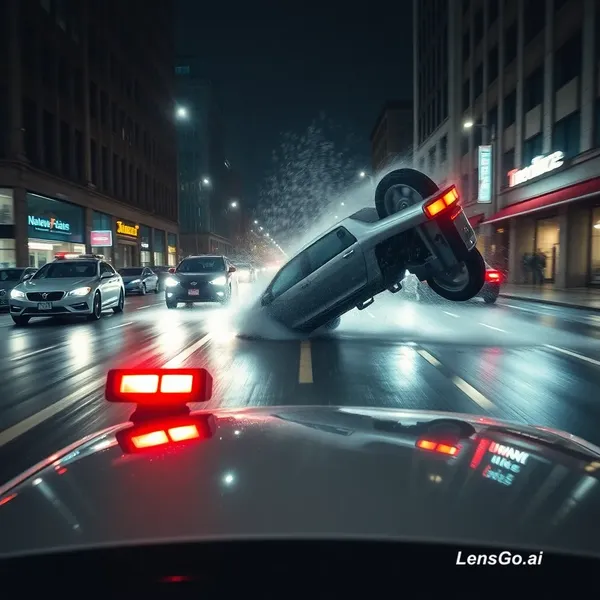 A cinematic, high-speed car chase at night on a wet city street during a rainstorm. The camera is mounted on the front hood of a police car, capturing the flashing red and orange emergency lights in the foreground. A silver sedan is seen speeding away through traffic, splashing through puddles. The police car accelerates, weaving through the wet streets to catch up. The chase reaches a climax when the silver sedan loses control, clips another vehicle, and flips over spectacularly in mid-air, spinning toward the camera amidst a spray of water and debris. The lighting is dramatic, with city neon and streetlights reflecting off the wet pavement.