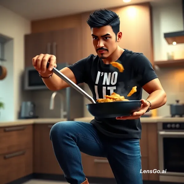 Full-body 3D male character matching reference image (short spiky black hair, trimmed mustache, medium-brown skin, black “I’M SO LIT” t-shirt, blue jeans, brown shoes). Action: Mid-motion cooking in a modern kitchen. One hand holding a frying pan, flipping food in the air. Slight body twist, knees slightly bent, dynamic posture. Focused facial expression. Environment: Modern kitchen interior, warm lighting, subtle steam rising from the pan, motion blur on the flipped food. Realistic 3D render, cinematic lighting, slight depth of field. Style: High-detail 3D game render, Unreal Engine look, realistic textures, dynamic energy.