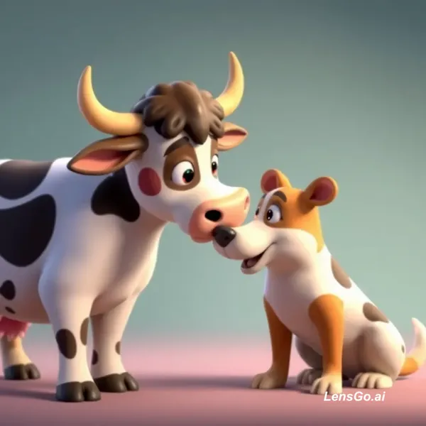 Copy करो: “3D cartoon animals talking to each other, cow and dog conversation, kids animation, colorful, Pixar style”