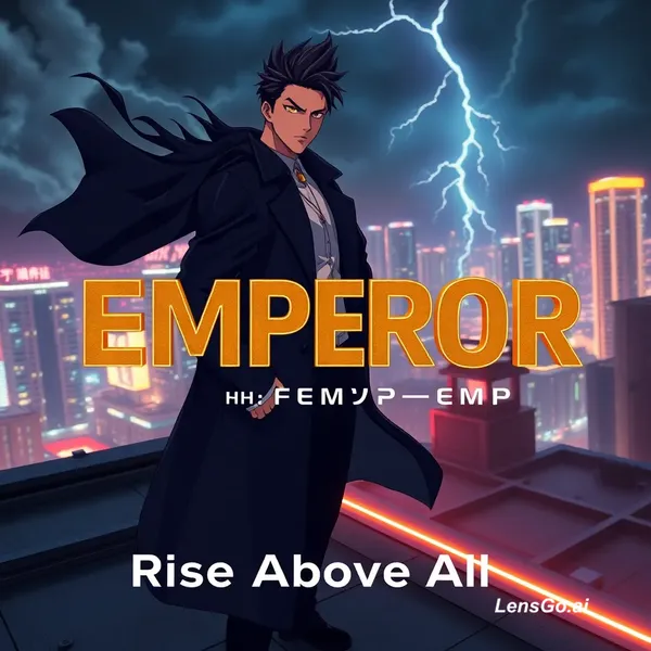 Create a high-end cinematic anime-style animated video. Scene: A powerful male anime character standing on a futuristic rooftop at night overlooking a neon cyberpunk city skyline. Wind blowing his long coat dramatically. Subtle lightning flashes in the background. Camera slowly pushes in with smooth cinematic motion. Style: Premium Japanese anime film quality, sharp linework, high-detail shading, dramatic lighting, volumetric fog, glowing city lights, realistic reflections, ultra HD, 4K quality, smooth 24fps animation. Character Design: Confident, dominant aura, glowing eyes, sharp jawline, modern futuristic outfit with subtle gold accents. Strong leadership presence. Mood: Powerful, elite, mysterious, dominant energy. Add floating cinematic text overlay that appears with smooth fade-in and particle effects: "EMPEROR" "EMP" "Rise Above All" Typography: Bold, futuristic sans-serif font, metallic gold texture with subtle glow, 3D extrusion effect, soft shadow, cinematic light reflections. Animation of Text: Letters assemble from particles, slight motion blur, glowing edges, professional motion graphics style. Color Palette: Deep blues, black, neon cyan, gold highlights. Rendering: Ultra-detailed, high contrast, cinematic depth of field, realistic anime movie quality, professional film composition.