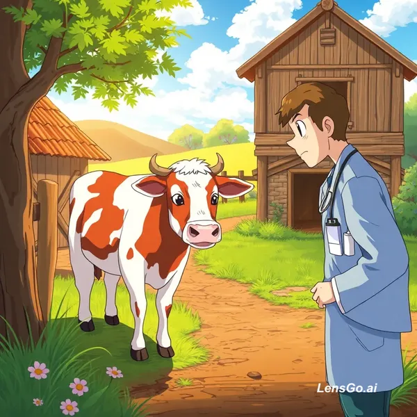 ''anime style farmer worried about sick cow in village, veterinary doctor coming, emotional scene, bright colors'' make anime video of this prompt