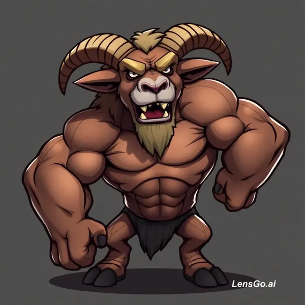 AI Image: Create a game character of a strong goat with muscular arms and features. It should look angry and s