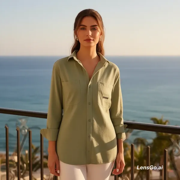 Please place the dress shown in the attached image on a realistic female model. The model should be standing on a balcony with an ocean view in the background. The scene should have a warm summer vibe with natural sunlight, soft shadows, and a luxury aesthetic. The model should look elegant and confident, with minimal styling to keep the focus on the dress. Make the final image look like a high-end fashion photoshoot.
