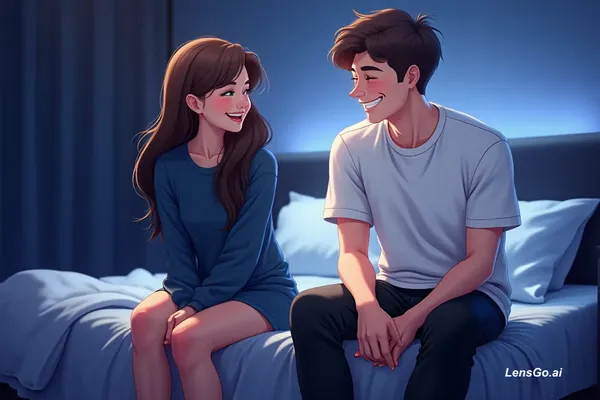 AI Image: A happy young couple laughing together in a room dark room Bluelighting , romantic mood, 2D animatio